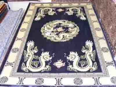 顏色及圖案:藏藍(lán)色地,白色傳統(tǒng)“雙龍戲珠”圖案手工編織地毯?少x予居室裝潢復(fù)古莊重的感覺。