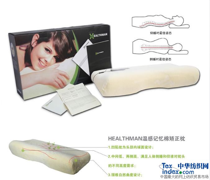 HEALTHMAN枕頭按照人體工學(xué)設(shè)計,完全貼合頭部、頸部及肩部曲線,使頸椎保持自然彎曲狀態(tài),減少落枕可能并防治打鼾。同時配合HEALTHMAN材質(zhì)的溫感減壓性能,HEALTHMAN枕頭能夠有效吸收人體壓力,將頸部與枕頭之間的壓力化解為零,減少酸痛點的產(chǎn)生,促進血液循環(huán),使大腦保持有氧狀態(tài),有助于緩解疼痛和提高睡眠質(zhì)量。另外,HEALTHMAN材質(zhì)的細(xì)胞結(jié)構(gòu)是開放式的,由于每個細(xì)胞單位間是相互連通的,它能夠讓空氣在整個枕頭間流通,因此透氣性能非常好,比起普通枕頭來,它會讓您感到更加清爽舒適。而且這種材質(zhì)能抑制霉菌生長,驅(qū)除霉菌繁殖生長產(chǎn)生的刺激氣味。
